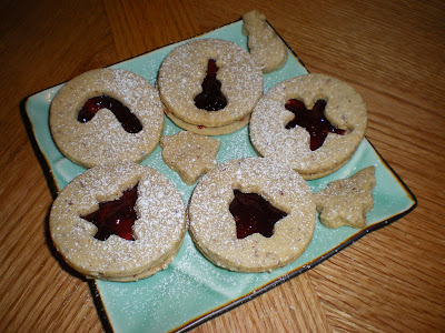 My sister pleads with me to make these throughout the year, but they're a bit labor-intensive so I only make them before Christmas. The hazelnut dough lends a bit of spiciness, the red raspberry jam makes them festive, and the snowy dusting of confectioners sugar reminds me of Christmas. I bake the cutouts from the middle as bonus bite-sized treats. I also give them away as holiday gifts in colorful Chinese take-out boxes I get from the party store. They won't fail to please!
