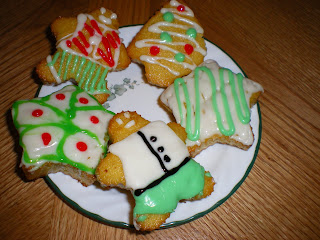 So I saw these Eggnog Mini-Cakes in the King Arthur Flour catalog along with a recipe, and couldn't wait to make them. I ordered the festive holiday molds, but decided to pass on the eggnog flavor, and just replace the milk with eggnog. Wrong move. The cakes came out all right, like your average yellow cake, but they didn't taste noggy. I was guilty of licking the batter bowl, though, and that did taste like eggnog. Go fig. Decorating with royal icing is a fun project.