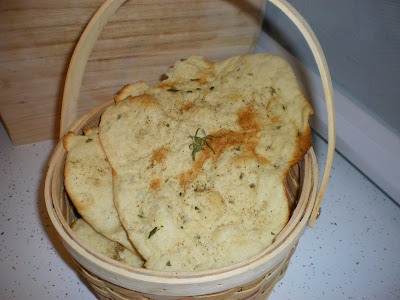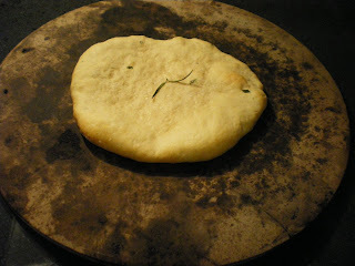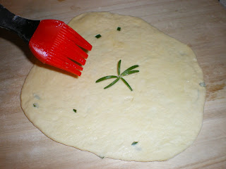 Punch down the dough, and divide into 4 pieces. Gently roll each piece into a 6-inch disc. Don't roll them too thin, or they'll have the dryness and consistency of a cracker instead of the softness and texture of a bread. Brush with oil, sprinkle with salt and pepper, and decoratively top with pieces of rosemary.