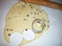 Combine the flour, baking powder, and salt in the bowl of an electric mixer fitted with the paddle attachment. You can also make this in a food processor with the metal blade like I did, or by hand with a pastry blender. Add the butter and mix on low speed until the butter is in pea-sized pieces. Mix the eggs and cream together, and quickly add them to the flour-and-butter mixture. Combine until just blended. Mix in the raisins or currants.