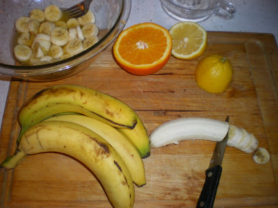 Then the bananas are sliced and tossed in orange juice and lemon juice to prevent them from browning. Rose Levy Beranbaum, whose recipe this is, says the orange juice cuts the intensity of the lemon juice.