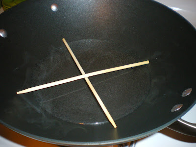 So here's how you steam. You can use one of the short, metal racks to elevate your heatproof plate in the wok or saucepan. But the traditional way is to crisscross a pair of wooden chopsticks above steaming water.